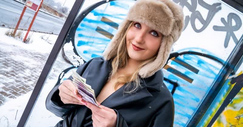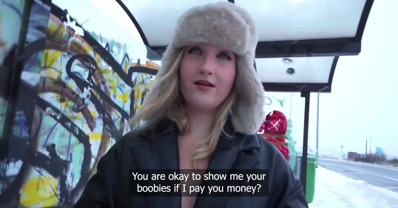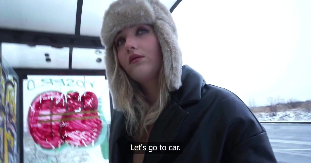 «Белокурая девка явно мерзнет, стоя на остановке зимой. Она ещё и одета не слишком тепло. Пикапер сразу понял, что блондинка является развратной и она ему точно даст, нужно только назначить высокую цену за интим. Телка охотно показала попку на морозе и поехала к незнакомцу ебаться. Она взялась делать ему смачный минет, отсасывая толстый хер, а потом отдалась в пизду, получая удовольствие и наслаждаясь еблей.»