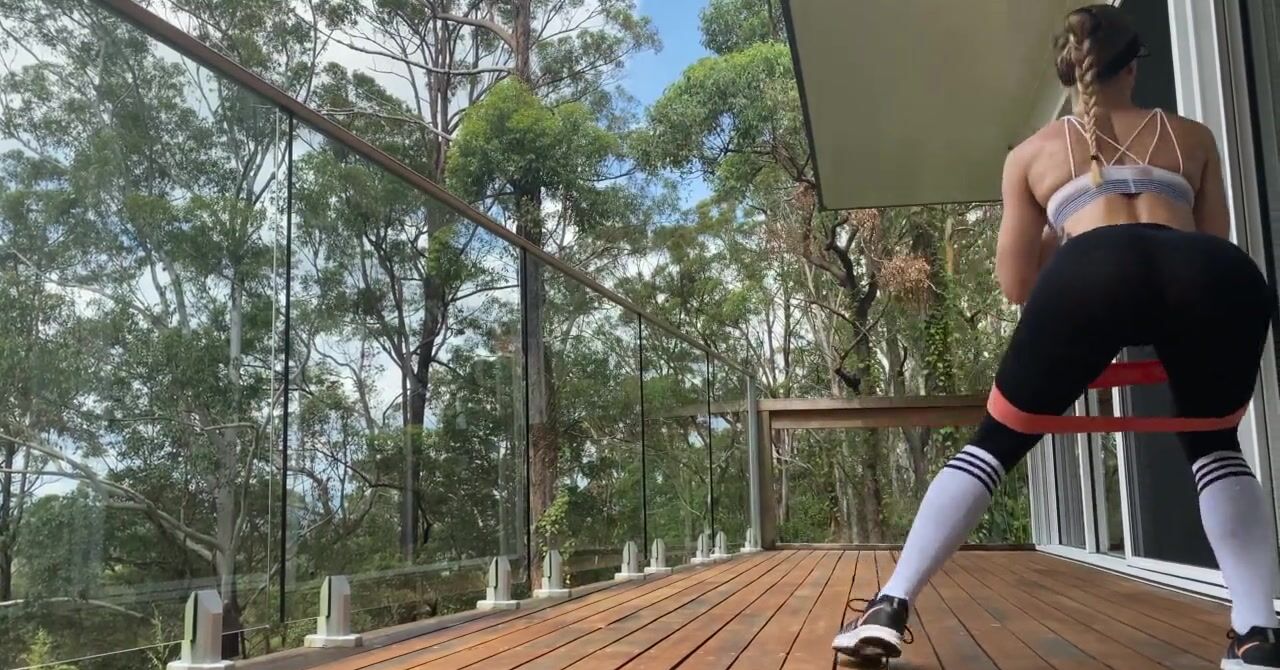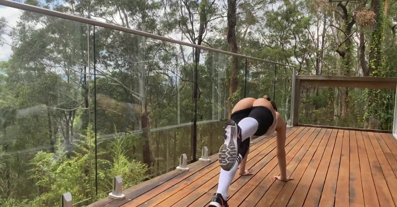 Тренировка на балконе с анальной пробкой в упругой жопе