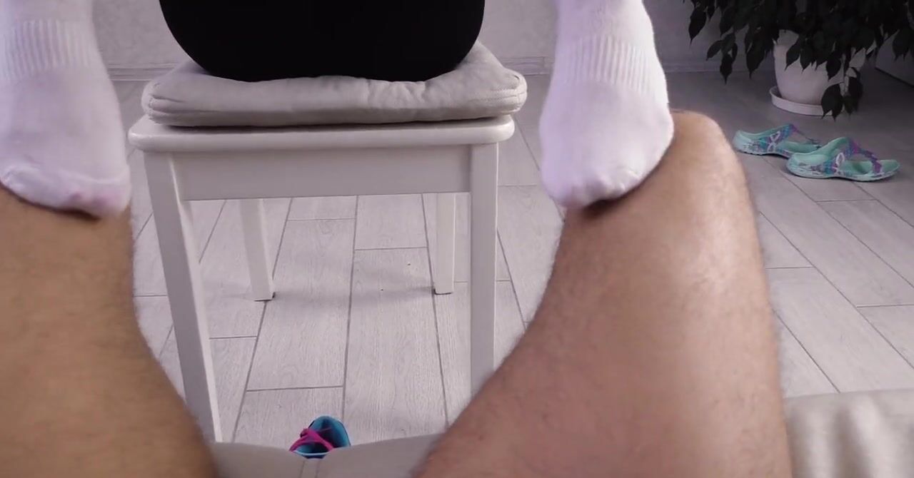 «Привлекательная жена собиралась на тренировку, но муж просит её задержаться дома, чтобы супруга могла приласкать его хуй своими ногами. Футфетишисту это безумно нравится, он обожает когда женушка так делает. Блондинка не отказывает мужу, она готова опоздать в спортзал. Развратница сперва ласкает член в белых носочках, которые вскоре снимает. А ещё эта жаркая развратница позволяет кончить ей на ножки.»