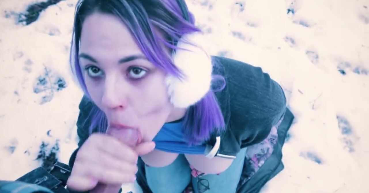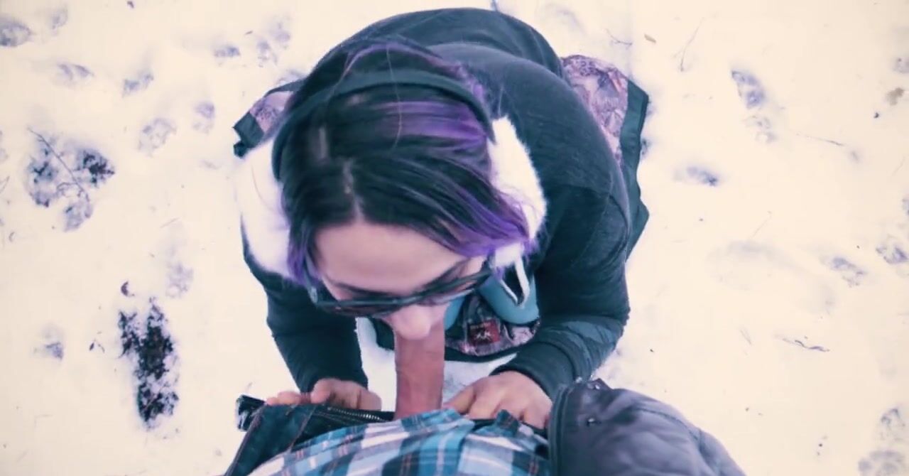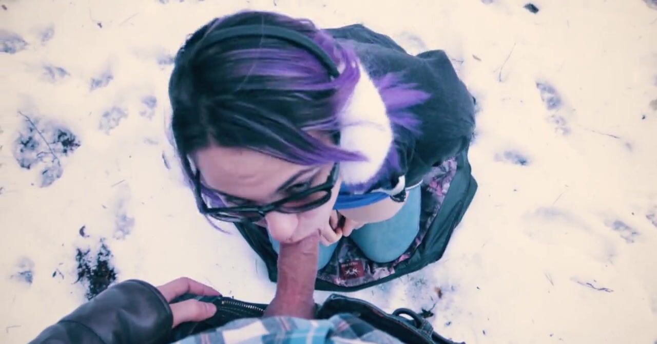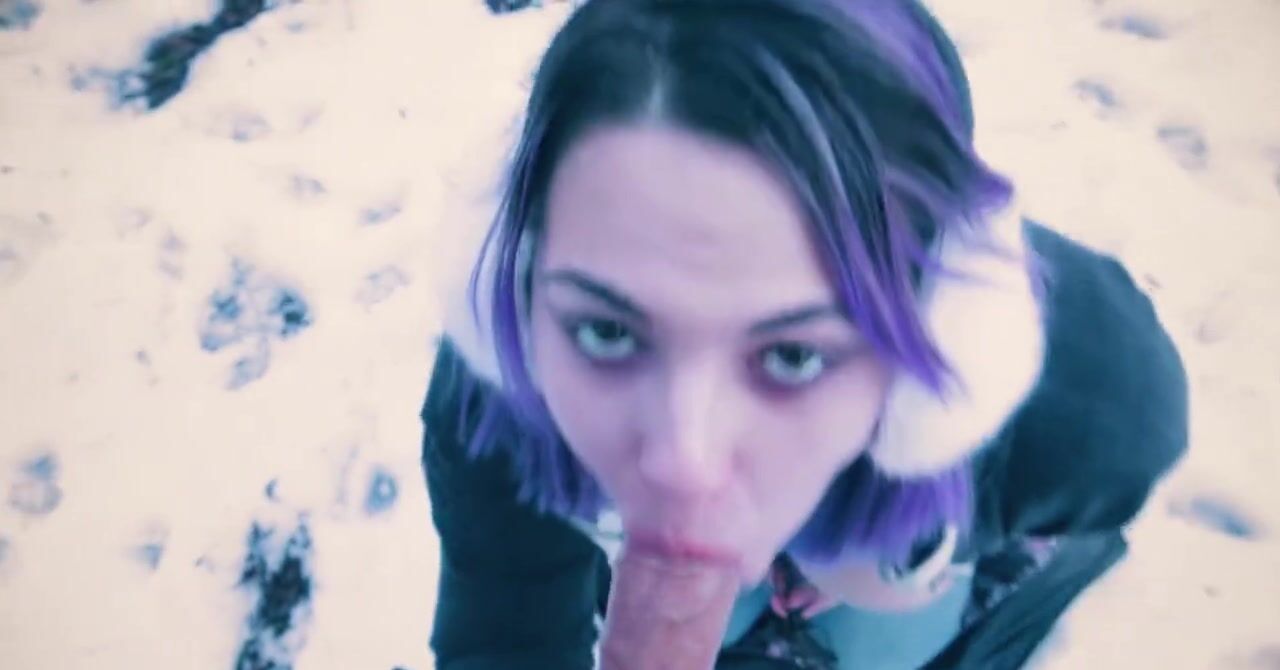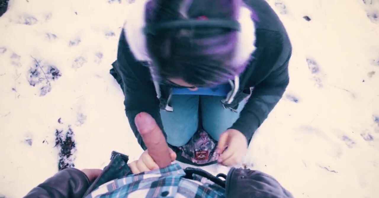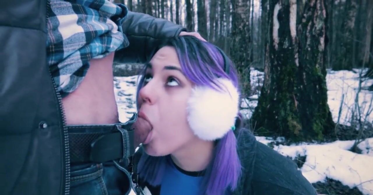 Девка с фиолетовыми волосами делает смачный минет в зимнем лесу