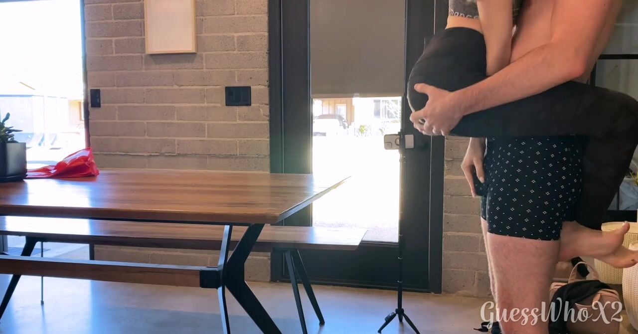 «Возбужденный мужик спускает лосины с привлекательной девушки и вставляет в её пизду твердый член, жарко трахая красотку на столе. Телке всё это нравится, они не трахались уже несколько дней, так что бойфренд ведет себя безумно страстно и даже немного агрессивно. Худышка кайфует, стонет и ласкает киску пальцами, чтобы наверняка получить оргазм. Она позволяет парню кончать в неё, и показывает как сперма вытекает.»