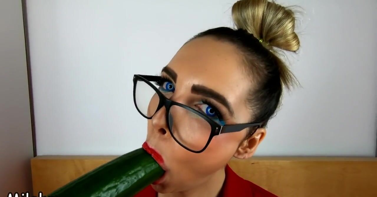 «Синеглазая учительница в очках надеялась, что к ней придет студент за дополнительное занятие и она соблазнит его на еблю, но планы парня поменялись в самый последний момент. Теперь преподавательница не знает что ей делать, она ведь возбуждена до придела. Приходится решать проблему старым методом, белокурая развратница достает самый большой огурец, который смачно сосет и потом мастурбирует им, получая удовольствие.»