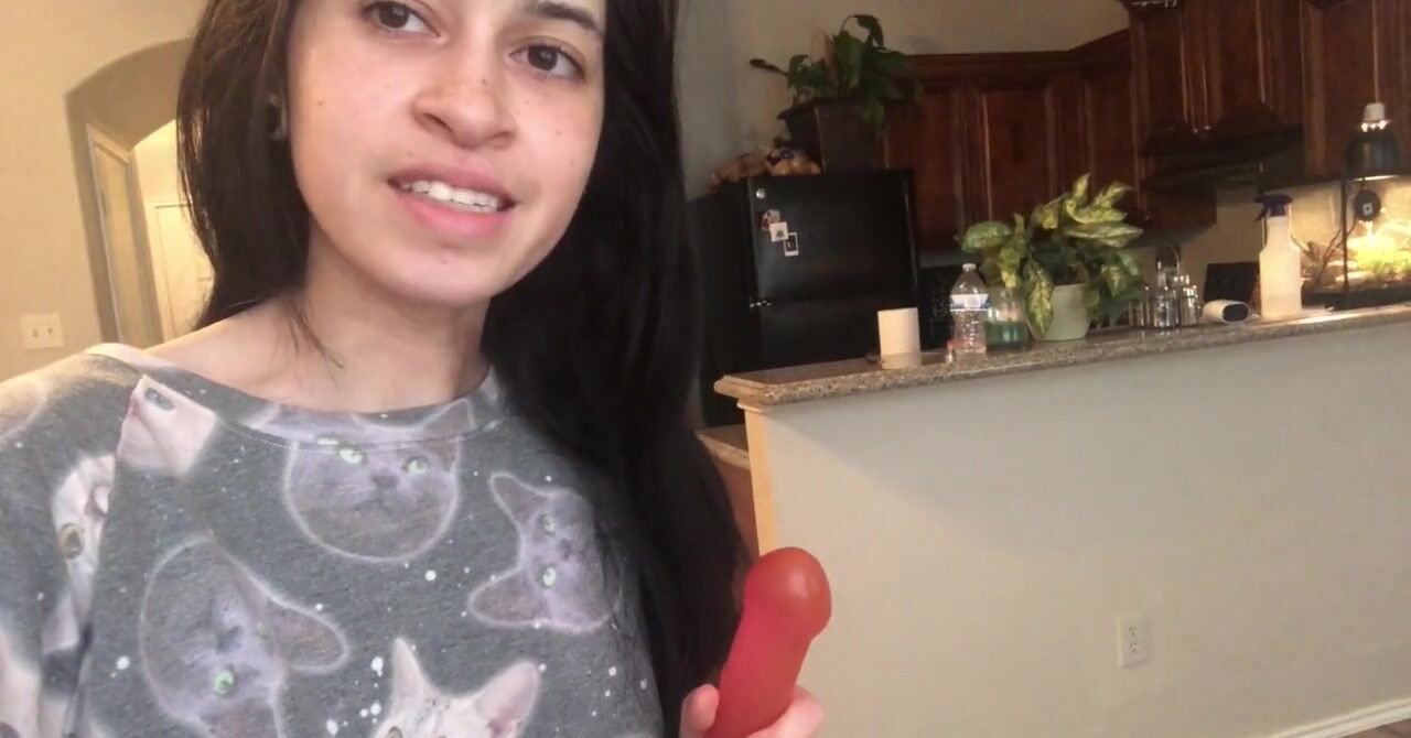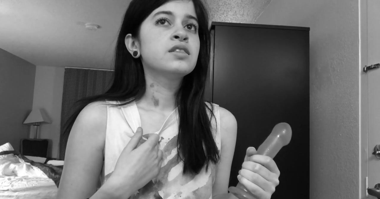 «Сегодня миниатюрная студентка почти весь день занимается тем, что мастурбирует дома, а так же снимает своё хоум видео. Эта привлекательная телка с маленькими сиськами купила себе искусственный член и теперь развлекается с ним. Она засовывает дилдо в узенькую щелку, а так же облизывает его, пробуя себя на вкус. Стройной развратнице безумно понравилось мастурбировать, но она всё равно лучше бы занялась сексом.»